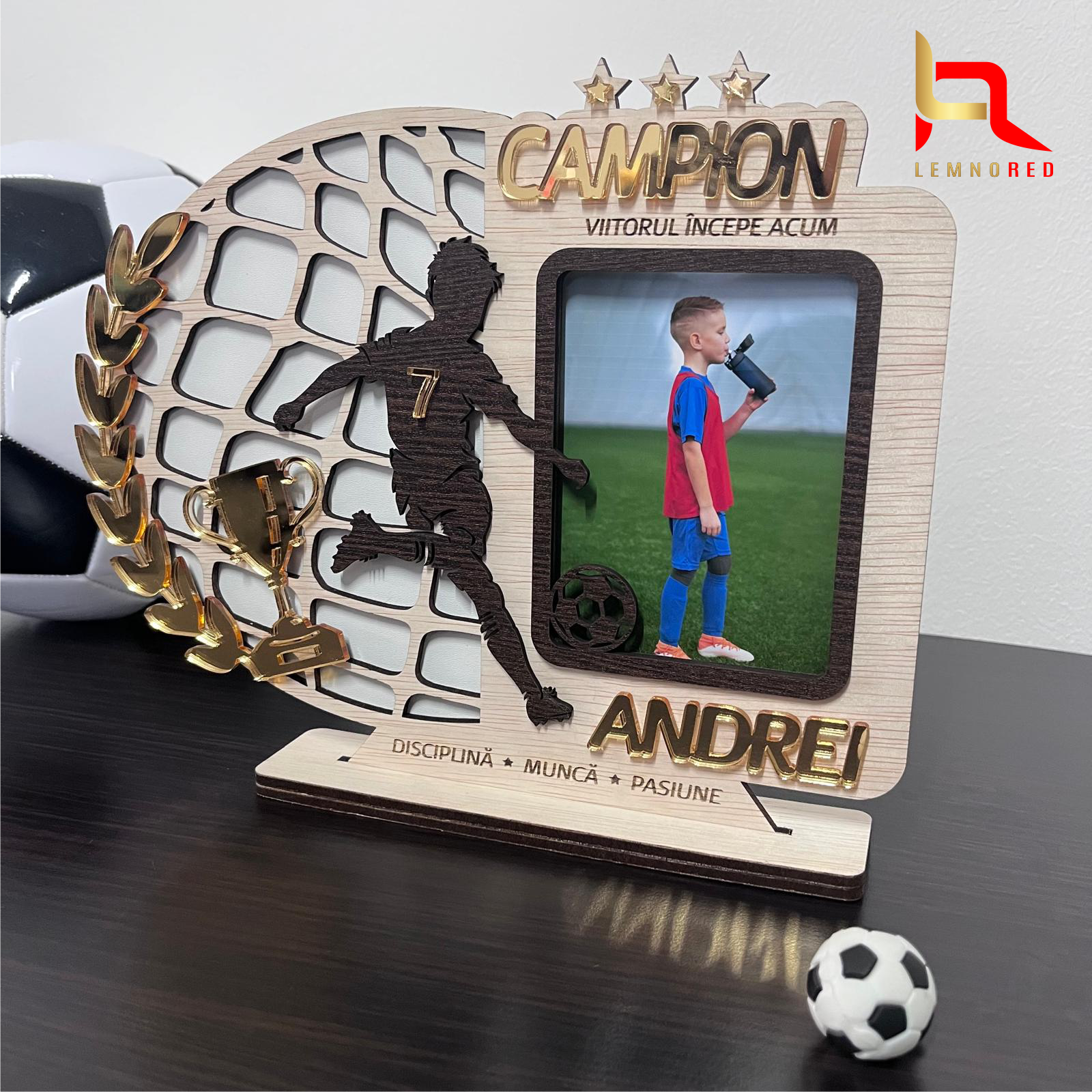Rama foto personalizata din lemn pentru copii – model fotbal Campion